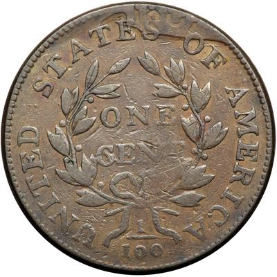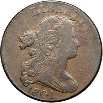 1801 NC-2 R7. Fine-15. Noyes Plate Coin. Slightly better where properly struck, but there is some weakness (as always on this variety) on the face and the opposing area below NT in CENT. Attractive glossy medium brown with light brown and tan toning in protected areas, especially on the obverse, and hints of reddish brown toning in the field before the face. The surfaces are smooth but do show a few nicks, the notable ones close under the T in LIBERTY, left of the base of the O in ONE, and close over the N in CENT. EDS, Breen state I, with sharp, strong die clashmarks at ES-OF. Finest of only 8 known. Called F15 net F12 by Noyes and CC#1, photo #20055. Bland says VG10 and CC#1. Both assessments appears very conservative, perhaps due to the slightly weak strike on the face and the opposing area under NT in CENT (which is consistently weak on all the known examples sharp enough to see those details). Removed from an NGC slab graded VF25 (NGC label included). This is the plate coin for the variety in the Noyes book. NGC Population 1; The only example graded at NGC for the variety. DWH #2564.