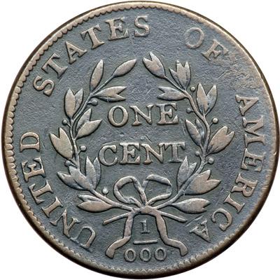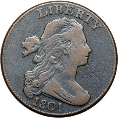 1801 NC-3 R6+ Error Fraction 1/000. VG-10. Noyes Plate Coin. Sharpness at least F15 but there are a dozen old pinscratches in the obverse fields, all nicely blending into the natural patina. Glossy dark olive brown with medium brown toning covering the highpoints, the two-tone appearance accenting the details and producing an attractive eye appeal in spite of the marks. The fields are covered with uniform microscopic roughness under the glossy patina, but there is no verdigris. Nicely struck EDS from perfect dies, as always. Tied for finest of 14 known examples. Noyes calls this cent F15 net VG8 and tied for CC#1, photo #21618. Bland also nets this one at VG8, and it is tied for CC#1 in his census. Your cataloger is convinced this example is the best of the lot, and it certainly offers the sharpest details. Plated in the Noyes book to represent the variety. Removed from an NCS slab graded "F details, obverse scratched," and the NCS label is included. DWH #2565.
