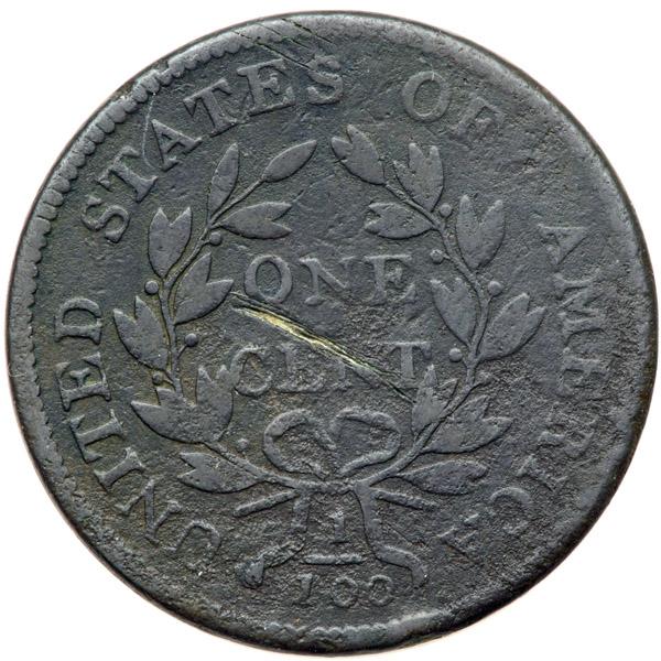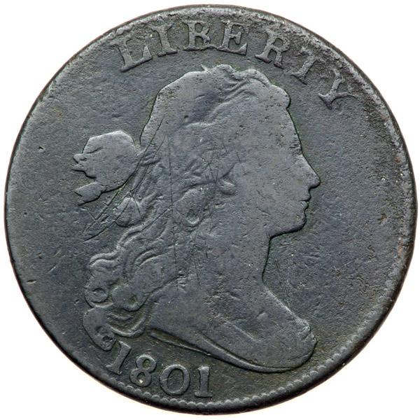 1801 NC-4 R7 G4+. Sharpness VG7 but the planchet is covered with microscopic roughness and porosity, strongest on the reverse. No verdigris, but there are several old, light scratches on the portrait, mostly in the hair and ribbon, plus a couple more at ES in STATES. The most significant mark is an obvious and rather deep scratch from the bottom of the O in ONE to the E in CENT. Dark steel and olive. The obverse is slightly glossy while the reverse is closer to matte. The date is bold and the legends are complete. The diagnostic die defect that connects the bases of the B & E in LIBERTY is obvious. Tied for CC#4 among only 9 examples known. The top two examples also are far from perfect with grades of VF25 net VG8 and VF20 net VG7, the significant deductions assessed for serious surface defects.