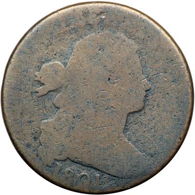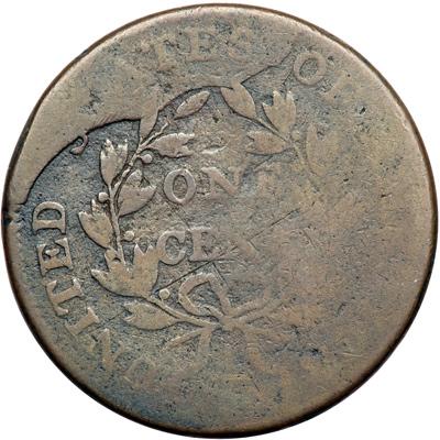 1801 NC-5 R7+. About Good-3. Discovery Coin. Plated in Breen and Noyes. Slightly glossy medium brown and chocolate with darker olive brown toning in the protected areas. The surfaces are decent for the grade but not perfectly smooth with very fine granularity visible in the fields and protected areas, especially on the reverse. No verdigris and only a few minor contact marks, including a short, light hairline scratch in the center of the neck and two other faint ones that cross at the base of the E in CENT. The date is clear, although the bottom blends into the rim below. LIBERTY is faint, AMERICA is extremely faint, but the remainder of the legend is readable and some areas of the reverse are rather strong. A large retained cud break affects STATES, and this catastrophic die failure accounts for the extreme rarity of the variety (only 4 examples are known, and all have the huge reverse break). This broken reverse die was discarded ending the very brief marriage, and the virtually new obverse die was mated with the famous "3-error reverse" die to produce the S-219 die variety. This is the discovery coin for the variety. Called Fair-2 and finest known in the Bland census. Noyes says Fair-2 and tied for CC#1 in his list, photo #20039 (although a photo comparison indicates the example offered here is the superior cent). This is the plate coin for the variety in the Noyes and Breen books. DWH #2808.