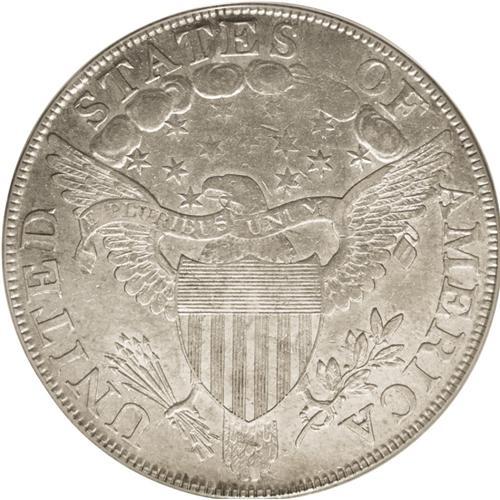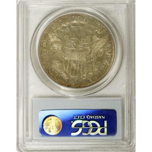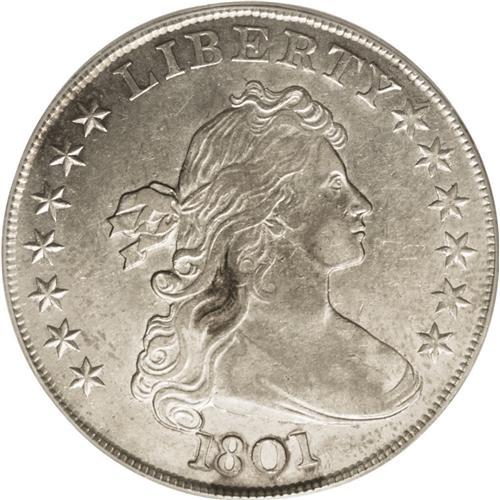<B>1801 S$1 AU50 PCGS.</B></I> B-4, BB-214, R.4. The first 1 in the date nearly touches the hair curl, while the last 1 is distant from the bust. This pretty silver dollar offers much luster remaining on the silvery surfaces, with a glint of amber near the rims on each side. A small area of brown toning is noted behind Liberty's neck. Only light highpoint rub is visible, and the strike is bold. A beautiful problem-free specimen.<BR><BR><b>Shipping:</b> Coin/Currency (<a target="_blank" href="http://www.heritageauctions.com/common/shipping.php">view shipping information</a>)