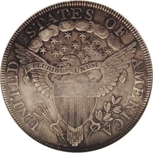 <B>1801<img border='0' src='http://www.heritagecoins.com/images/star.gif' width=10 height=10>$1 AU53 NGC.</B></I> B-1, BB-211, R.3. Bowers Die State V. Medium gray with traces of luster in the fields. The surfaces are average for the grade, with a few minor handling nicks but no rim problems or adjustment marks are present. Splashes of darker toning are found in the reverse fields. A very late die state for this variety, with extensive die clashing found on both sides, and the reverse die has shattered. There is a die crack through ST of STATES which continues through the clouds to the AM, and there is a thin die crack through AMER with that section displaying severe die sinking weakening the stars on the obverse. This is the latest die state usually seen with several examples reported during the past decade.