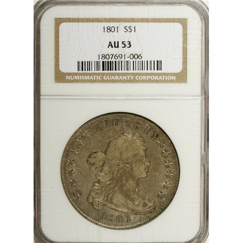 <B>1801 S$1 AU53 NGC.</B></I> B-3, BB-213, R.3. Original dove-gray and pearl-gray toning enriches this problem-free and pleasing example. Liberty's cheek and shoulder show the expected moderate wear, but both fields and devices are surprisingly void of abrasions. The rims are particularly undisturbed.<BR><BR><b>Shipping:</b> Coin/Currency (<a target="_blank" href="http://www.heritageauctions.com/common/shipping.php">view shipping information</a>)