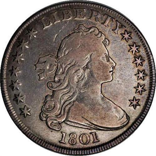 <B>1801<S$1> B-1, BB-211, R.2. VF20 NGC.</B></I> Star 8 close to Y, star 13 distant from bust; Outer arrow point under center of U. Reiver die state a. Bowers-Borckardt die state I. A fairly early die state of this variety, with just a hint of the die cracks on the reverse through TA of STATES. Light gold and gray in color, with attractive surfaces. We do note a minor scrape below LIB on the obverse which will serve to identify this coin.<BR><I>Ex: James F. Ruddy (April, 1970).</B></I> Envelope Included.