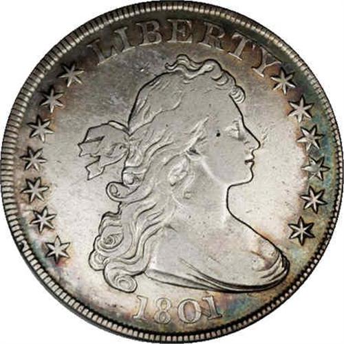 <B>1801<S$1> B-1, BB-211, R.2. VF30 NGC.</B></I> Star 8 close to Y, star 13 distant from bust; Outer arrow point under center of U. Reiver die state c. Bowers-Borckardt die state V. This coin boasts lovely blue and gold peripheral toning with bright silver to the centers. Better than average surfaces for the grade with only a few minor handling marks. On this final die state the reverse shows a dramatic bulge through MER which combines with extensive clash marks on both the obverse and reverse die. Note the clashed wing tip near the outer tip of the second star on the obverse, and the clouds and portions of TES through the date, on the reverse the clashmarks are stronger, with star points clearly defined above and below the left wing tip, the date near OF, and drapery lines in that same area. It was just about scrap heap time for the reverse die when this coin was struck.<BR><I>Ex: Julian Leidman (March, 1996).</B></I> Envelope Included.