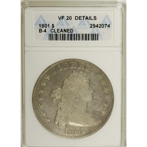 <B>1801 S$1 --Cleaned--ANACS. VF20 Details.</B></I> B-4, BB-214, R.4. Wispy hairlines cross this tan-gray early dollar, but the knowledgeable collector will easily forgive these, since the reverse in particular is bold for the VF20 Details designation, and there are no mentionable marks.<BR><BR><b>Shipping:</b> Coins & Currency (<a target="_blank" href="http://www.heritageauctions.com/common/shipping.php">view shipping information</a>)