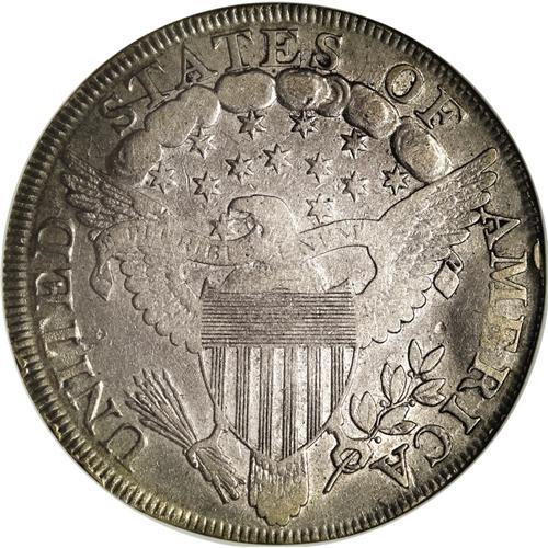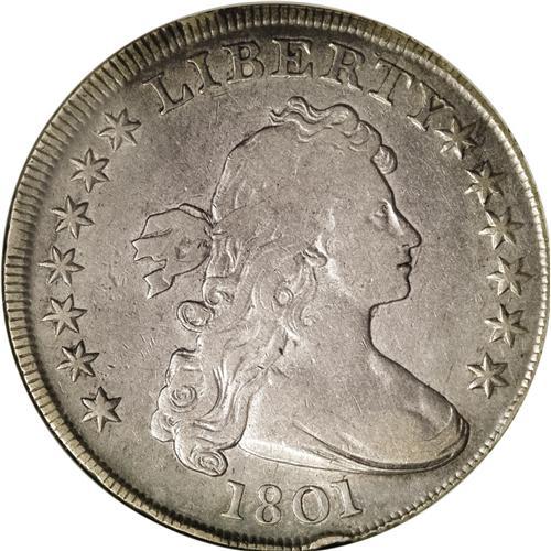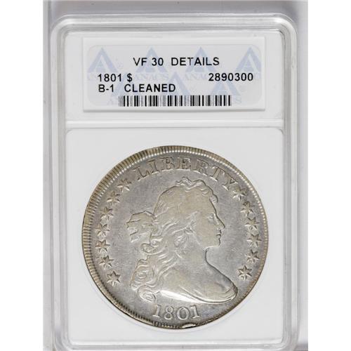 <B>1801<img border='0' src='http://www.heritagecoins.com/images/star.gif' width=10 height=10>$1>--Cleaned--ANACS. VF30 Details.</B></I> B-1, BB-211, R.3. Bowers-Borckardt Die State V. A bit too bright from the noted cleaning, but retoned into dove and khaki-gray colors. Rim dings can be seen below the date and at 3 o'clock on the reverse. There is a significant die bulge visible on the reverse through MER; this is as struck and diagnostic of this late die state. Moderately worn with areas of striking weakness through the motto and the eagle's head.