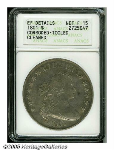 <B>1801<S$1>--Corroded, Tooled, Cleaned--ANACS. XF Details, Net Fine 15.</B></I> B-2, BB-212, R.2. Light gray-lavender surfaces are finely hairlined and illustrate some pitting around LIBERTY. The obverse fields appear to have been smoothed in places, and several light marks are noted on Liberty's motif. Relatively nice detail is seen on the design elements.