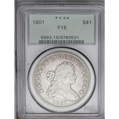 <B>1801<img border='0' src='http://www.heritagecoins.com/images/star.gif' width=10 height=10>$1> Fine 15 PCGS.</B></I> B-1, BB-211, R.3. Die State I; no trace of the die crack left of 1 is readily visible. Light silver-gray surfaces with glints of amber-gold on the obverse periphery. A pleasing example that lacks major abrasions. A couple of reverse pinscratches through the eagle's left (facing) wing are noted. In a PCGS green label holder.<BR><I>From The Steve Glenn Collection.</B></I> <BR><BR><B>Important notice:</B> Heritage usually auctions material at the rate of 200-250 lots per hour. On some occasions eBay Live bid software or the Internet may not be able to keep up with the pace of the auction. We recommend placing a realistic absentee bid now as insurance to avoid disappointment. Occasionally the auctioneer may eliminate or reject an eBay Live bid, and the auctioneer may also reopen a lot after the close of the eBay live bidding (usually because we missed an audience bid), and may reject your bid even if it shows you as the winning bidder. By bidding via eBay Live, you agree that Heritage may award the lot to another bidder at its sole discretion under the circumstances described above or any other reasonable circumstances. Since eBay bids are not shown to us until we open the lot on the floor, we treat those bids just like floor bids. In most cases the floor responds before the eBay bid is presented to us, due to Internet lag time, so for consistency we have made it a policy that floor bids are always considered first over tie eBay live bids. Also please note that all Heritage lots purchased through eBay Live carry a 20% Buyer's Premium. Please make sure you read the Terms and Conditions before you bid. This lot is being auctioned in conjunction with a live floor auction by Heritage Galleries & Auctioneers. All final auction and invoice information will be supplied by Heritage Galleries & Auctioneers, and all other information should be considered preliminary. Lot:2150 <BR><BR><B>Winning Notification and Billing:</B> After the FINAL session in this auction is complete, Heritage will send e-mail and snail mail invoices. This process normally takes several days. All final auction and invoice information will be supplied by Heritage Galleries & Auctioneers, and all other information should be considered preliminary. <BR><BR>This auction will be conducted on a live auction floor and over the Internet through eBay Live. If you choose to place an absentee bid, please take a moment to <font color='#0000ff'><u><a href='http://pages.ebay.com/liveauctions/help/before/laabsentee.html'>learn how eBay Live absentee bidding works</a></u></font><font color='#000000'>