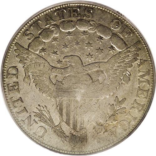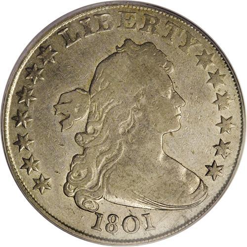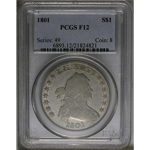 <B>1801 S$1 Fine 12 PCGS.</B></I> B-4, BB-214, R.4. Die State III. First 1 nearly touches curl, second 1 distant from bust; leaf below center of I. This obverse is sometimes called the Close Date, although both obverse dies have approximately the same size date. All four varieties dated 1801 are elusive, and the B-4 die combination is scarcer than the others. A tiny reverse die crack extends inward from the border right of the final S, apparently an unusual feature that is only seen on terminal die state examples of the variety. Both sides have scattered abrasions and faint scratches with light gray color throughout.<BR><I>Ex: Irvine Gold Mine (5/2001).</B></I><BR><I>From The William Luebke Collection.</B></I><BR><BR><b>Shipping:</b> Coin/Currency (<a target="_blank" href="http://www.heritageauctions.com/common/shipping.php">view shipping information</a>)