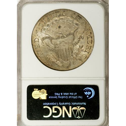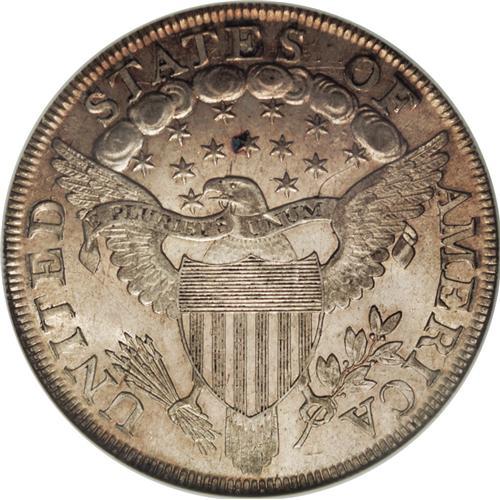 <B>1801 S$1 MS60 NGC.</B></I> B-3, BB-213, R.3. The small dot to the left of the center dot immediately identifies this obverse, which was paired with three different reverses to create the B-1 through B-3. The distance from the 1 in the date to the curl is about the same as the distance from star 8 to the serif of the Y. On the reverse a star point touches the <I>outside</B></I> of upper part of the beak, and all the T's are missing their right feet (the result of a defective punch). The star under cloud 7 is double-punched.<BR> This is the so-called "second" Die State II as outlined in the Bowers-Borckardt reference (because of a typo in the text), with bold clash marks visible throughout the reverse. However, some of those clash marks are not in their expected locations, because the <I>obverse die clashed at least once off-center compared with the reverse die.</B></I> The obverse stars 1 through 7 are visible clashed at (reading backwards on the reverse), respectively, the first S in STATES (but too close to the edge); the left (facing) wing tip (moving inward, and subsequently); between D and the wing; underneath the upright of D; beneath the upright of E; and between NI. A second set of centered clash marks appears to be in the expected locations. This piece is lustrous and attractive, with a light golden-amber cast to each side. While we cannot say for certain that they are the same coin, this interesting piece appears to be quite similar, and to be of similar quality, to the Bareford B-3 specimen (Stack's, 10/1981), lot 420, also cataloged as MS60. Rare so fine.<BR><BR><b>Shipping:</b> Coin/Currency (<a target="_blank" href="http://www.heritageauctions.com/common/shipping.php">view shipping information</a>)