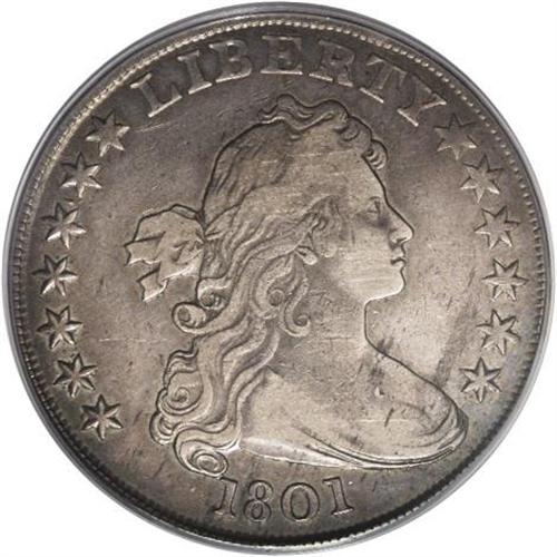<B>1801 S$1 VF20 PCGS.</B></I> B-4, BB-214, R.3. Die State III. A tiny die chip below the lowest curl and left of the first 1 is usually seen on this obverse, a hallmark of the variety. This example represents the scarce late die state, seen with much less frequency than either Die State I or II. It is marginally finer quality than the Luebke Collection example of the same die state. The surfaces are pleasing lilac-gray with lighter tan color on the devices and splashes of darker steel toning on both sides.<BR><BR><b>Shipping:</b> Coins & Currency (<a target="_blank" href="http://www.heritageauctions.com/common/shipping.php">view shipping information</a>)