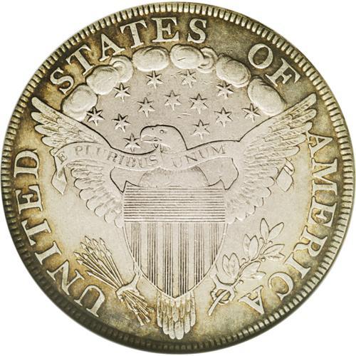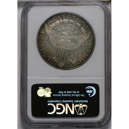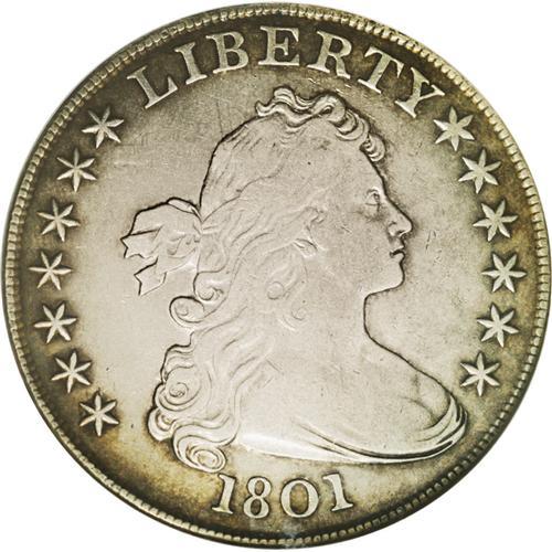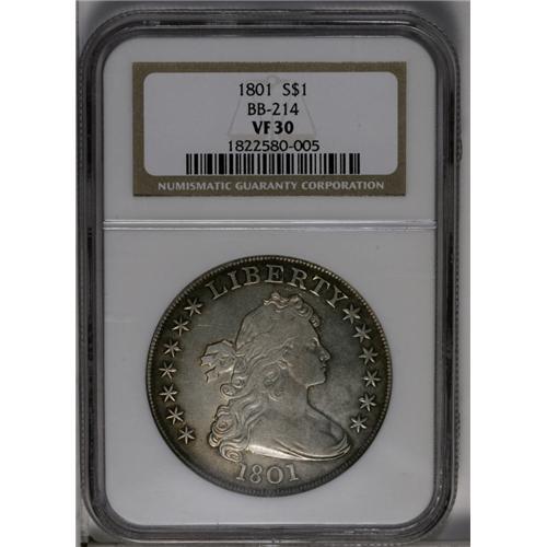 <B>1801<img border='0' src='http://www.heritagecoins.com/images/star.gif' width=10 height=10>$1> VF30 NGC.</B></I> B-4, BB-214, R.4. A scarce variety quickly identified by the proximity of the 1 in the date to the curl. This piece has a surprising amount of remaining luster for the given grade, and the medium russet-brown peripheral toning also provides eye appeal. A slightly sunken and discolored area in the lower right obverse field is mentioned.<BR><I>From The Long Beach Family Collection.</B></I> <BR><BR><B>Importa