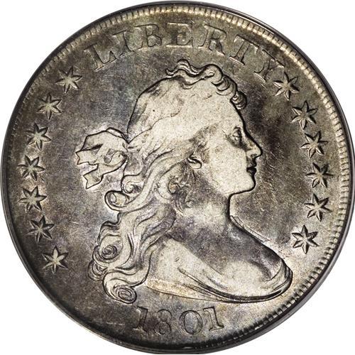 <B>1801 S$1 VF30 PCGS.</B></I> B-2, BB-212, R.3. Only four varieties of this date were coined for circulation just after the turn of the 19th century, while a proof "restrike" was coined many years later. Although not particularly rare in the middle circulated grades, this date is much scarcer than adjacent dates. Mottled gray-gold toning is seen over light silver-gray surfaces on both sides.<BR><BR><b>Shipping:</b> Coins & Currency (<a target="_blank" href="http://www.heritageauctions.com/common/shipping.php">view shipping information</a>)