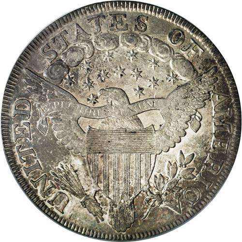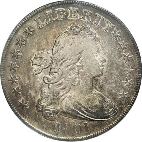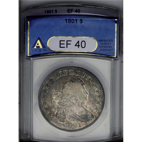 <B>1801<img border='0' src='http://www.heritagecoins.com/images/star.gif' width=10 height=10>$1> XF40 ANACS.</B></I> B-3, BB-213, R.3. Ample traces of remaining luster glow from the hair, plumage, clouds, and legends. Splashes of forest-green, orange, and pearl-gray embrace this nicely defined example, which shows moderate wear on the cheek and drapery. Free from adjustment marks or relevant abrasions. <BR><BR><B>Important notice:</B> Heritage usually auctions material at the rate of 200-250 lots per hour. On some occasions eBay Live bid software or the Internet may not be able to keep up with the pace of the auction. We recommend placing a realistic absentee bid now as insurance to avoid disappointment. Occasionally the auctioneer may eliminate or reject an eBay Live bid, and the auctioneer may also reopen a lot after the close of the eBay live bidding (usually because we missed an audience bid), and may reject your bid even if it shows you as the winning bidder. By bidding via eBay Live, you agree that Heritage may award the lot to another bidder at its sole discretion under the circumstances described above or any other reasonable circumstances. Since eBay bids are not shown to us until we open the lot on the floor, we treat those bids just like floor bids. In most cases the floor responds before the eBay bid is presented to us, due to Internet lag time, so for consistency we have made it a policy that floor bids are always considered first over tie eBay live bids. Also please note that all Heritage lots purchased through eBay Live carry a 20% Buyer's Premium. Please make sure you read the Terms and Conditions before you bid. This lot is being auctioned in conjunction with a live floor auction by Heritage Galleries & Auctioneers. All final auction and invoice information will be supplied by Heritage Galleries & Auctioneers, and all other information should be considered preliminary. Lot:2152 <BR><BR><B>Winning Notification and Billing:</B> After the FINAL session in this auction is complete, Heritage will send e-mail and snail mail invoices. This process normally takes several days. All final auction and invoice information will be supplied by Heritage Galleries & Auctioneers, and all other information should be considered preliminary. <BR><BR>This auction will be conducted on a live auction floor and over the Internet through eBay Live. If you choose to place an absentee bid, please take a moment to <font color='#0000ff'><u><a href='http://pages.ebay.com/liveauctions/help/before/laabsentee.html'>learn how eBay Live absentee bidding works</a></u></font><font color='#000000'>