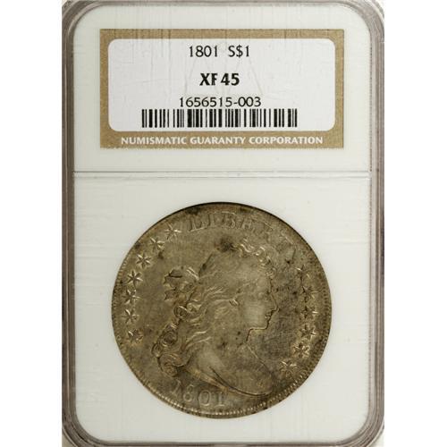 <B>1801 S$1 XF45 NGC.</B></I> B-2, BB-212, R.3. Bowers-Borckardt Die State II. A double set of bold clash marks on the field beneath Liberty's neck identifies this middle die state. This charming silver dollar has considerable glowing luster from the legends and devices, and neither side displays any mentionable marks.<BR><BR><b>Shipping:</b> Coin/Currency (<a target="_blank" href="http://www.heritageauctions.com/common/shipping.php">view shipping information</a>)