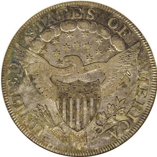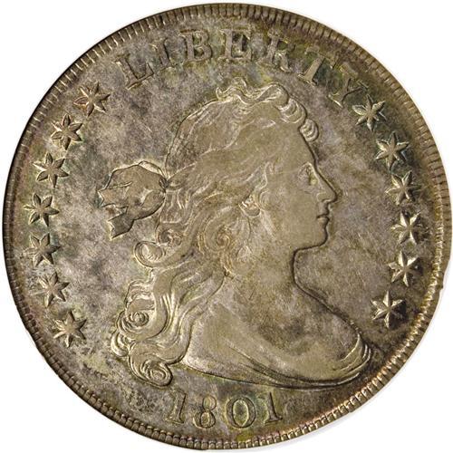 <B>1801 S$1 XF45 NGC.</B></I> B-3, BB-213, R.3. Die State II. This is the first Die State II in the BB reference. Both 1s in date equidistant from curl and bust; right base of each T is missing. In one of those typographical errors that drive all authors insane, five different die states for the 1801 B-3, BB-213 silver dollar in the Bowers <I>Silver Dollar Encyclopedia</B></I> are numbered I, II, II, II, and III, suggesting that the present cataloger could have done a better job proofreading! The B-3 variety represents the final use of this obverse die and the only use of the reverse die. The reverse has a light clash mark from the ribbon over M to star 6, above the right wing. It appears that this reverse die was engraved at about the same time as the obverse die for 1802 B-6 was engraved, as both dies utilized the same broken T punch. Although the order that dies were engraved is not necessarily the order they were used, this evidence suggests that the reverse of this 1801 die was probably not engraved until 1802. Light gray surfaces with intermingled lilac, gold, russet, and green toning on each side. A few faint hairlines and minor surface marks are evident upon close inspection. A two-point winner in the Old Dollar Whist match.<BR><I>Ex: Harry Laibstain (3/2005).</B></I><BR><I>From The William Luebke Collection.</B></I><BR><BR><b>Shipping:</b> Coin/Currency (<a target="_blank" href="http://www.heritageauctions.com/common/shipping.php">view shipping information</a>)