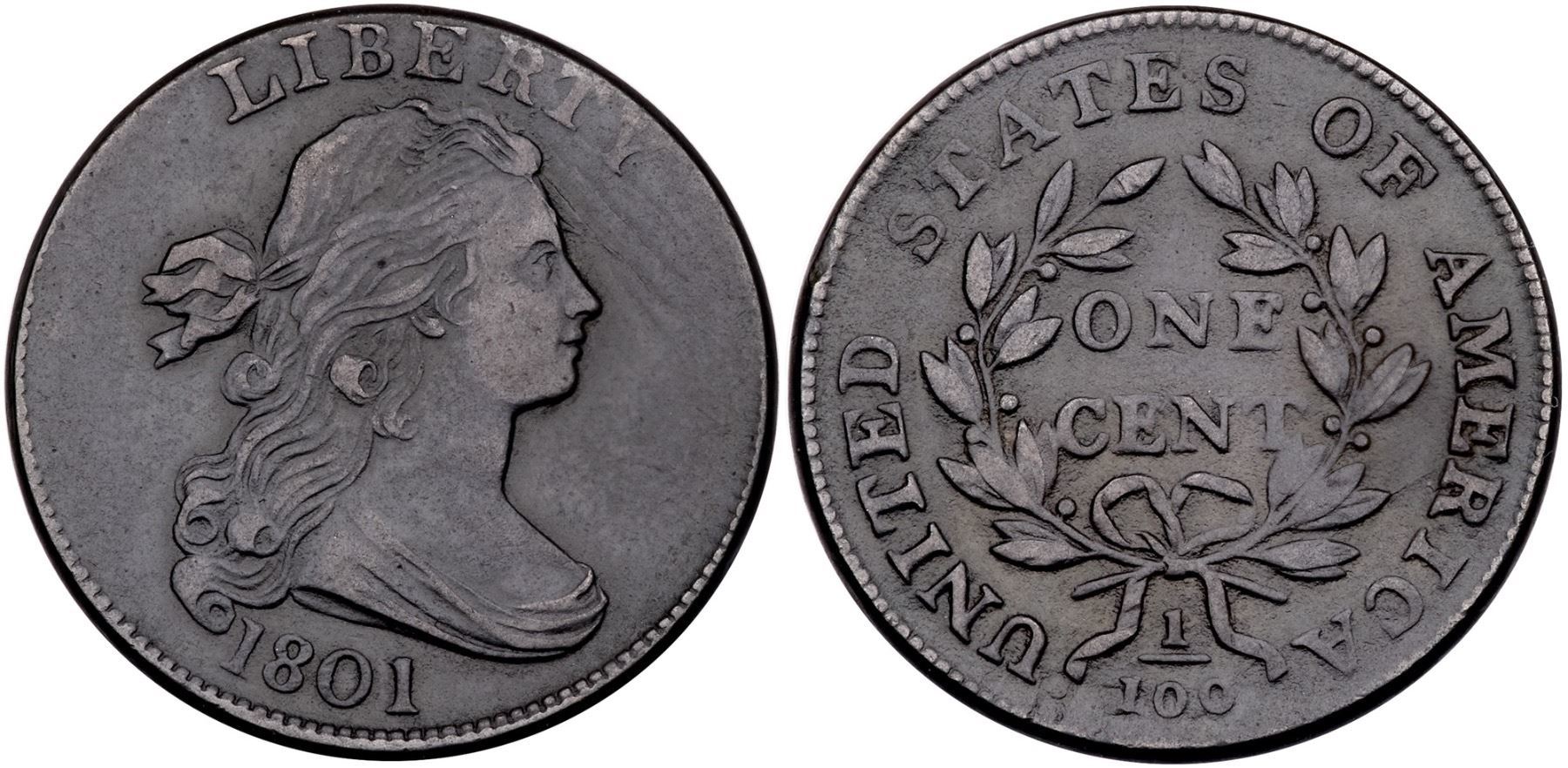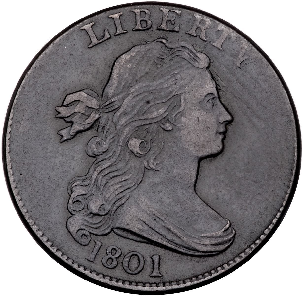 1801 S-213 R-2 VF2510 points sharper but dark with very fine microporosity visible under a glass and light roughness in some protected areas. Dark chocolate and olive browns. Free of notable marks. Glossy surfaces with decent eye appeal. MDS, Breen state V, with the wavy cracks in front of the face. Called VF30 by Bland in his census.Certificate Number: Pedigree: Ex; William Birr - C.F. Gordon Jr - Tom Morley 07/1979 - Delmar N. Bland - Phil Ralls - EAC 2013 sale lot 213 - Kevin Vinton