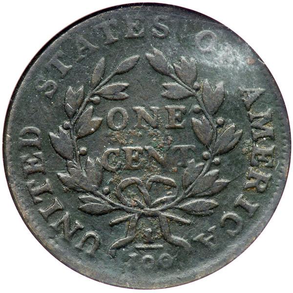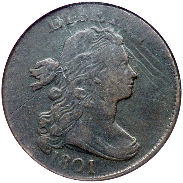 1801 S-213 R2 NCS graded Fine details, environmental damage. Sharpness F12 or slightly better but there are spots of raised verdigris around ONE CENT and the ribbon below. Otherwise the surfaces are decent and mostly smooth, although there may be extremely fine roughness under the glossy very dark olive and steel patina. The highpoints are a slightly lighter shade of chocolate brown. The only contact marks are a few fine scratches in the field behind the portrait, all blending nicely into the natural patina. MDS, Breen state V, with a series of parallel die cracks from ERTY into the field before the face. The date is strong and the legends are clear. Our grade is net VG10.