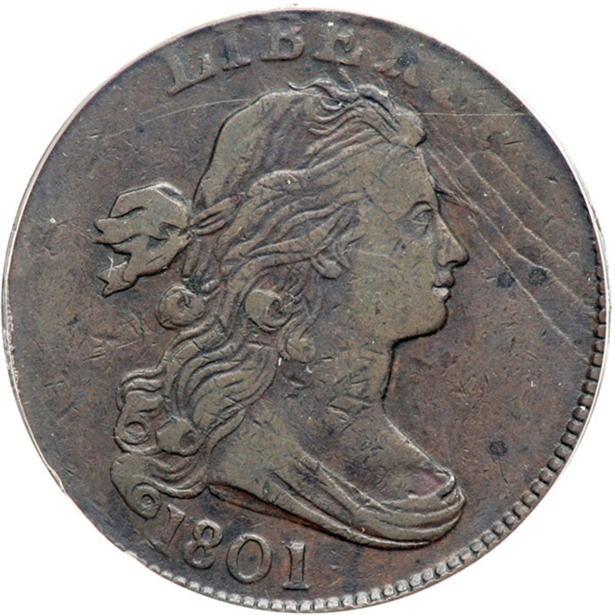 1801 S-213 R2 PCGS graded VF30. Glossy chocolate and light olive brown with a couple splashes of reddish chocolate toning on the reverse. Nice surfaces showing only a few minor marks, including a trio of small spots of shallow verdigris or crud in the field before the portrait and a very light pinscratch across the hair under BERT. M-LDS, Breen state VII. The wavy die cracks on the upper right part of the obverse are strong. Struck with the obverse die slightly misaligned to K-10. Our grade is VF20.