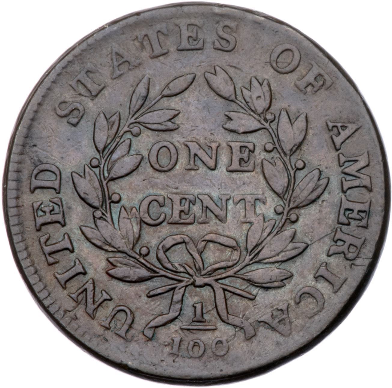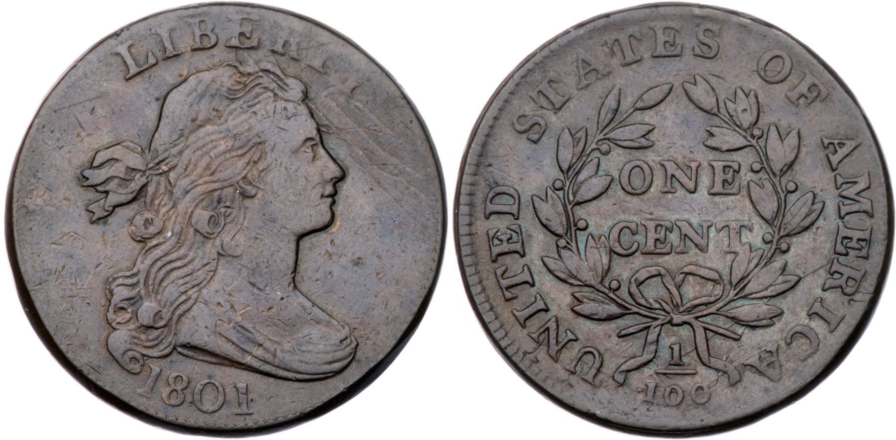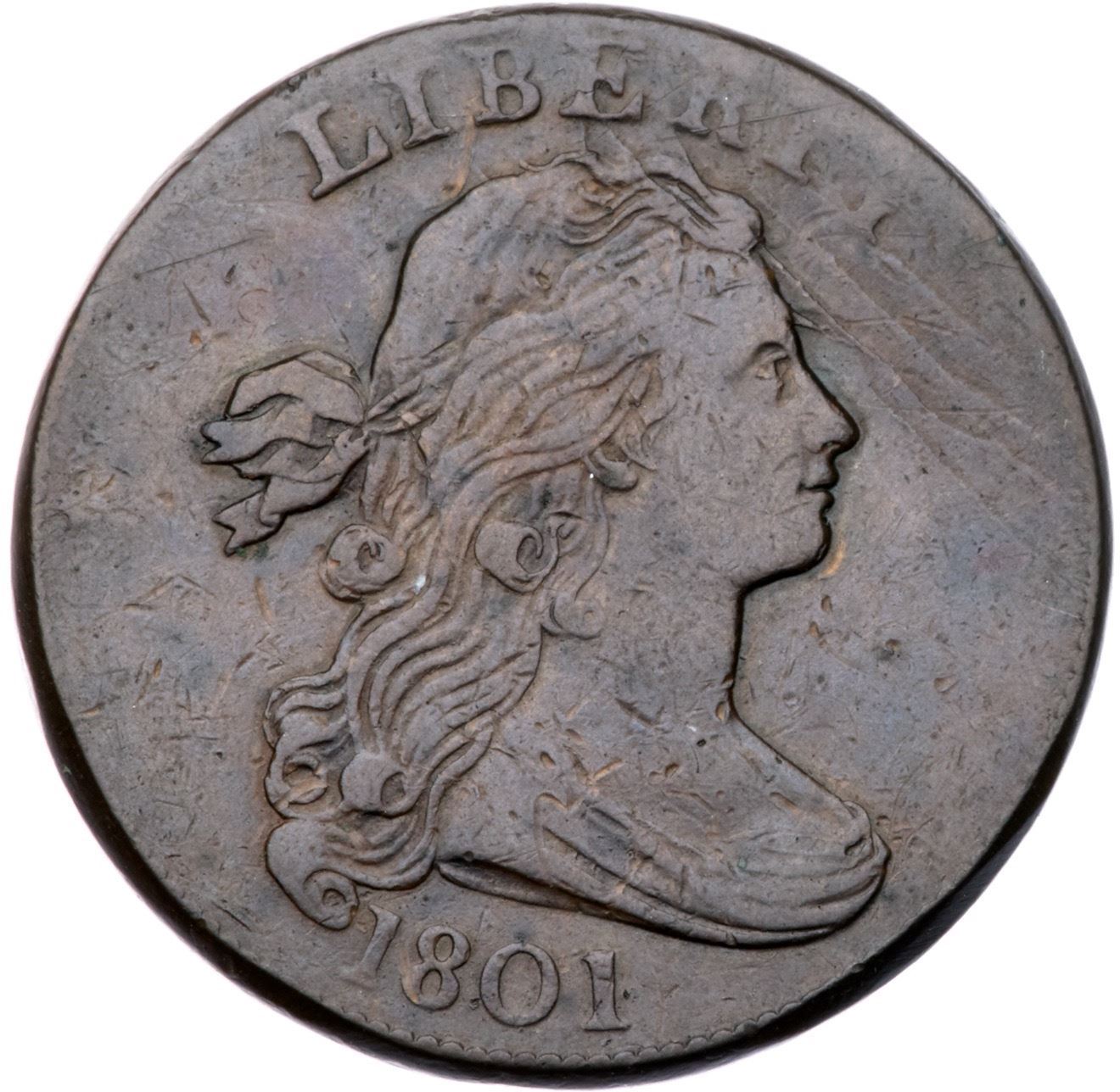 1801 S-213 R2 VF20At least 5 points sharper but there are small contact marks on both sides, none significant but a few too many for the sharpness grade. A pair of small, light rim bruises at the second S in STATES can help identify this cent. M-LDS, Breen state VIII, with die clashmarks, cracks on both sides, and a narrow rim cud from the U to the adjacent ribbon end. Graded VF30 net VF20 and tied for CC#17 in the Noyes census, his photo #32508. Comes with a nice provenance.Certificate Number: Pedigree: Ex Robert J. Kissner, Stack's 6/27/1975:334-James R. McGuigan 1979-Fred H. Borcherdt Collection