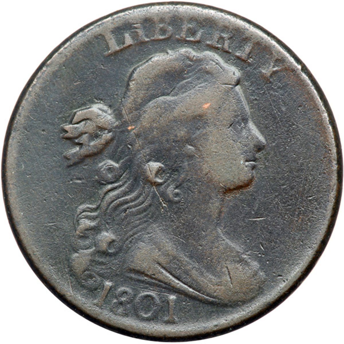 1801 S-216 R1 F12. Slightly sharper but there is an old, shallow scratch slanting through the hair right of the hair ribbon. Glossy dark chocolate and olive brown with lighter steel brown toning on the highpoints. The surfaces are decent but there are hints of extremely faint roughness hidden under the toning, strongest at AM in AMERICA. LDS. The date and legends are complete and clear.