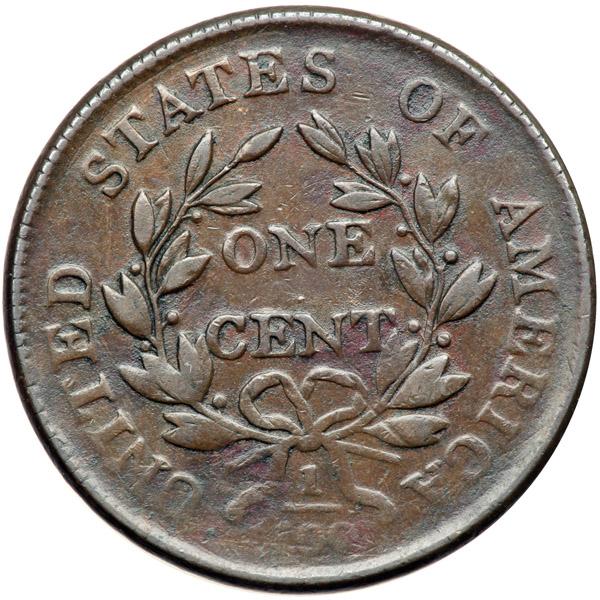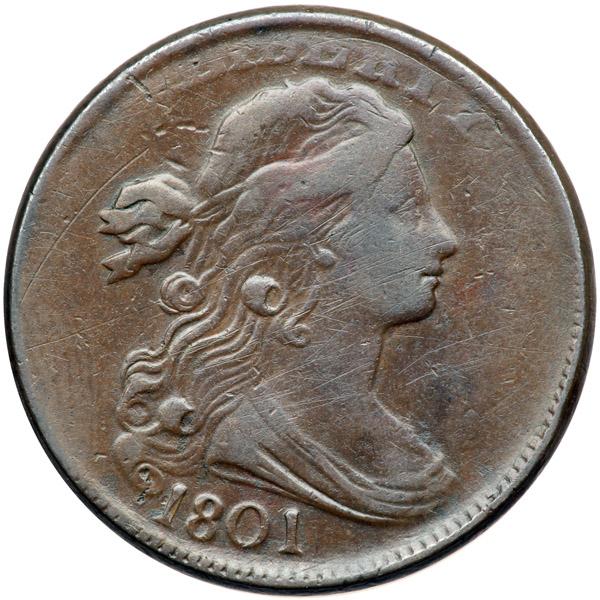 1801 S-216 R1 F15. Sharpness VF20, even better in those areas that were properly struck, but there are myriad faint hairline scratches on the portrait. Otherwise the surfaces are smooth and very attractive. Glossy medium chocolate brown with frosty luster peeking through in protected areas on the reverse. MDS, Breen state II. This cent was struck with the dies not in correct axial alignment (die faces not parallel). This caused significant weakness at the top of the obverse and bottom of the reverse. LIBERTY and the denominator are barely visible as a result. Breen mentions this feature is his description of state II. Pieces struck with the dies so far out of alignment can rightly be called mint errors, and this is an excellent example of that type of mistake.