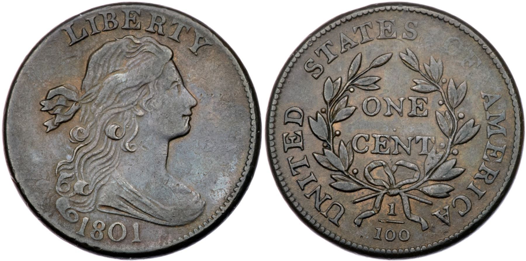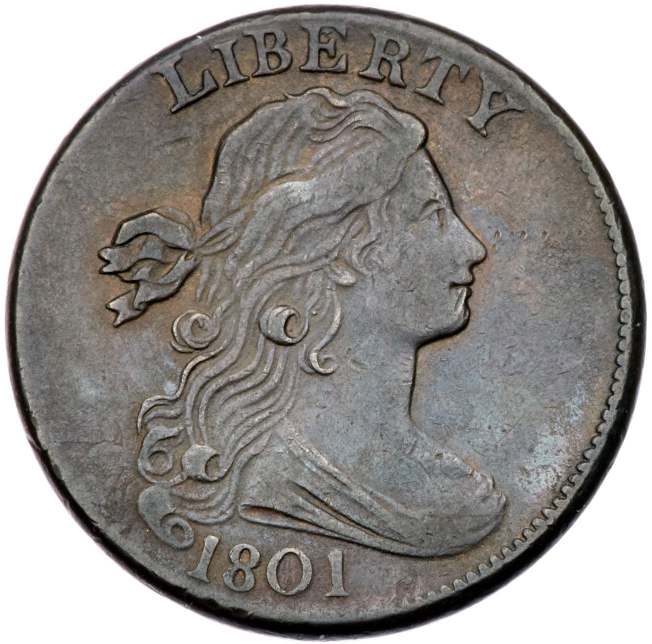 1801 S-216 R1 VF25Five points sharper with a line of tiny ticks in the field before the nose and a nick on the chin. Looks smooth but a glass reveals extremely faint roughness in the fields and protected areas plus some faint hairlines. Frosty light olive and steel brown. E-MDS, Breen state I late. Rather nicely struck for this variety with some weakness at the bust and OF. Graded VF30 net VF20 by Noyes, his photo #26793.Certificate Number: Pedigree: Ex George Ramont-Fred H. Borcherdt Collection (includes the Ramont collection envelope)