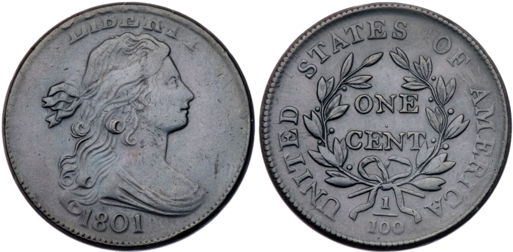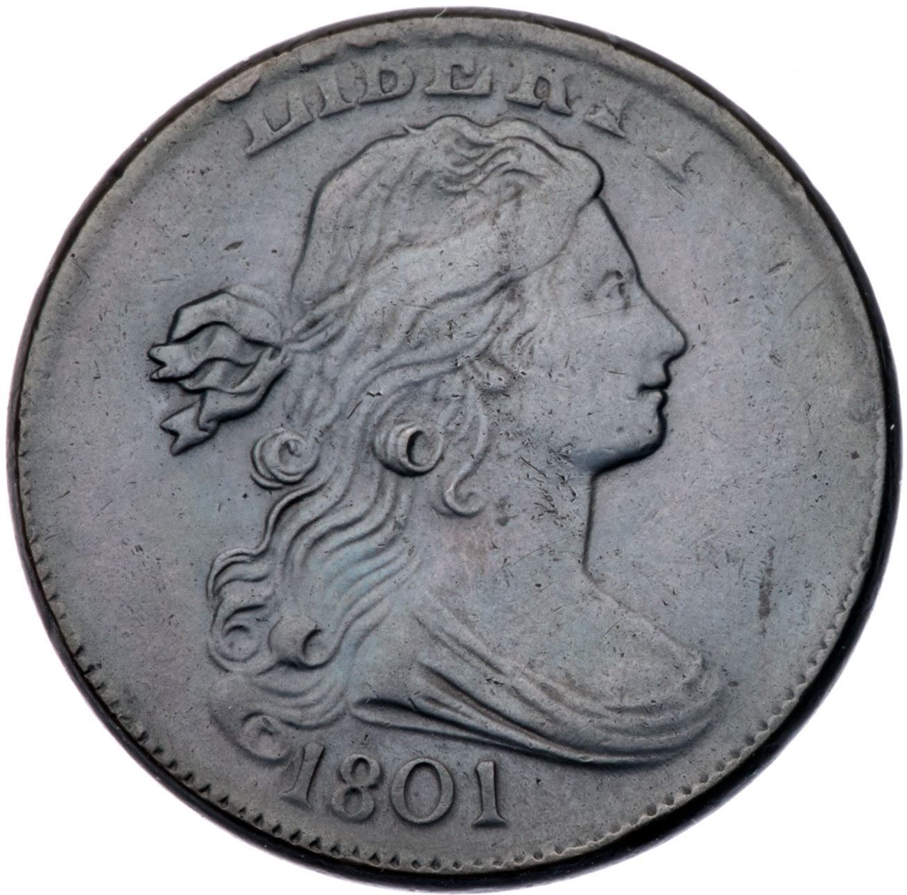 1801 S-216 R1 VF35Glossy light steel with lots of frost on the obverse. Possibly retoned long ago. Lightly worn with the sharpness of a slightly higher grade. The only marks are numerous microscopic ticks on the upper part of the neck. MDS, Breen state II. Nicely struck with drapery lines on the bust and a relatively strong OF. Noyes graded AU50 net EF45 and tied for CC#14, his photo #26012.Certificate Number: Pedigree: Ex Stack's 5/13/1982:210-Fred H. Borcherdt Collection
