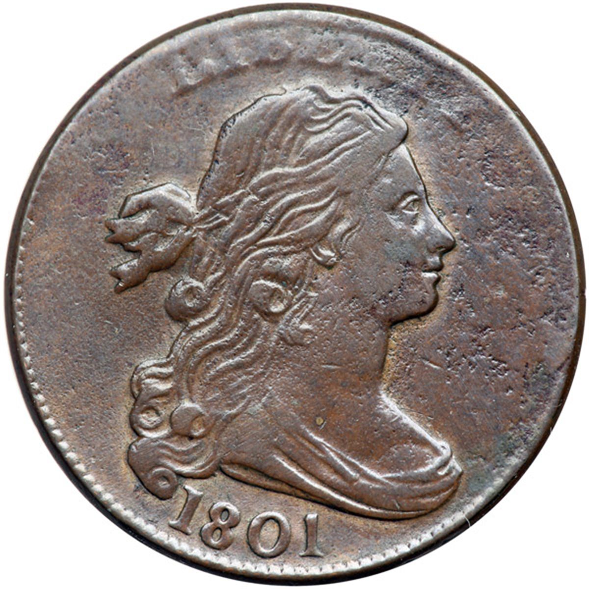 1801 S-219 R2 3-Error Reverse F15. Sharpness VF30 but burnished and retoned an attractive glossy light chocolate brown with traces of frosty lighter golden brown toning in some of the protected areas. There are traces of very light roughness in the field before the portrait but the remainder of the planchet is quite smooth. A tiny rim nick over the second S in STATES is a good identifying mark, but it is barely visible. MDS, Breen state IV. The 3 die-cutter errors are clear, although the 000 denominator is a bit weak due to the usual die failure in that spot. A decent example of the popular 3-error reverse variety in spite of the old cleaning.