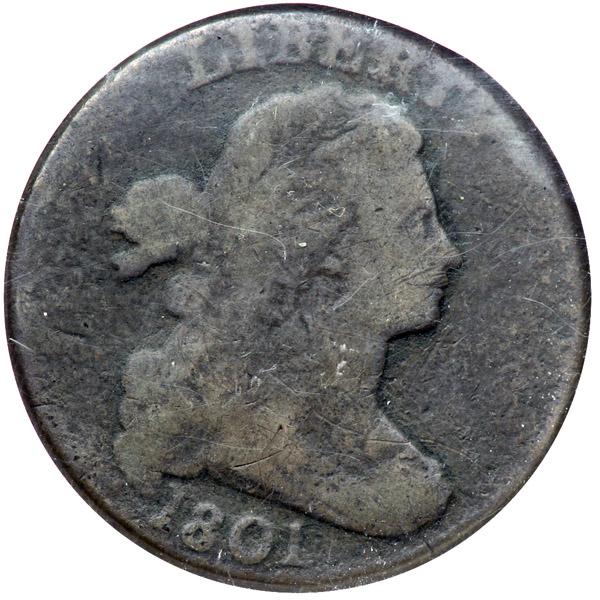 1801 S-219 R2 3-Error Reverse G5. Housed in a PCI slab graded VG10. Sharpness G6 or slightly better but a bit dull from microscopic roughness. No verdigris or notable marks. The date is clear and the legends are readable. All 3 of the die-cutter errors are visible on the reverse. The attribution is noted on the PCI label.