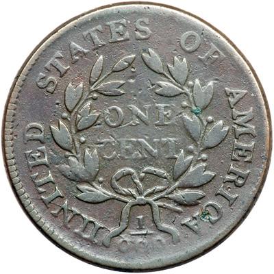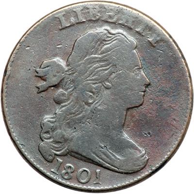 1801 S-219 R2 3-Error Reverse. VG-10. Very slightly sharper with extremely fine roughness in the field before the portrait, a small spot of greenish verdigris on the C in AMERICA, and another speck of similar verdigris on the wreath right of E in ONE. Otherwise the surfaces are smooth and offer decent eye appeal for the grade. MDS, Breen state IV, with a single die crack arcing through UNI and the fraction. The three die-cutter errors (U over inverted U, 1/000, and missing left wreath stem) are obvious. A nice example of this popular "Redbook" variety.
