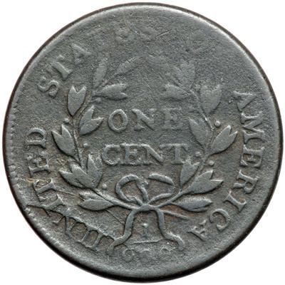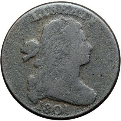 1801 S-219 R2. VG-7. 3-Error Reverse. A few points sharper but covered with uniform microscopic granularity. Slightly glossy dark olive and steel. No marks or verdigris, only a bit of fine dirt in protected areas around the wreath. M-LDS, Breen state V. All 3 of the die-cutter's errors on the reverse are clear. The date is strong and the legends are complete.