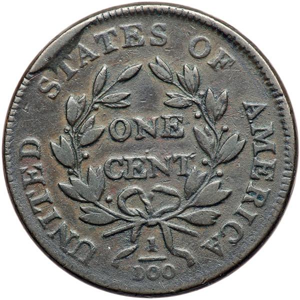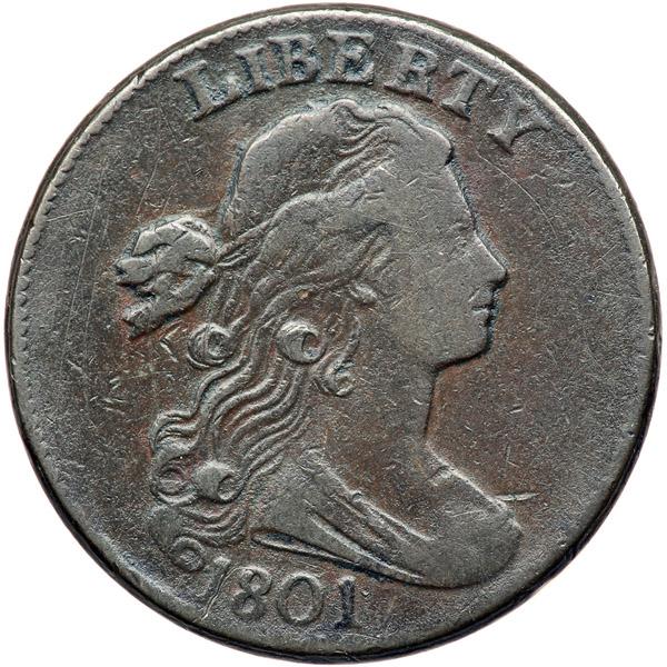 1801 S-221 R2 Corrected Fraction 100 over 000 VG10+. Sharpness near F15 but there are several old vertical scratches in the field behind the portrait. All the scratches blend perfectly into the attractive toning and the eye appeal remains decent. No roughness or verdigris. Glossy chocolate and steel with traces of lighter brown toning in protected areas on the reverse. Rare terminal die state (TDS), Breen state VI, with a strong cud break over STA that connects the top of that T to the rim. The date and legends are strong and the corrected fraction is clear.