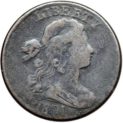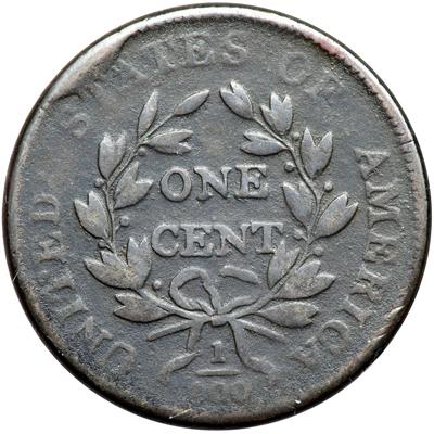 1801 S-221 R2. VG-7. Corrected Fraction 100 over 000. A bit sharper but covered with microscopic granularity under a slightly glossy dark chocolate and steel patina. No marks or verdigris. Rare LDS, Breen state VI, with a cud break connecting the tops of TA in STATES to the rim. The date and legends are complete and easily readable although not strong and the corrected fraction feature is visible.