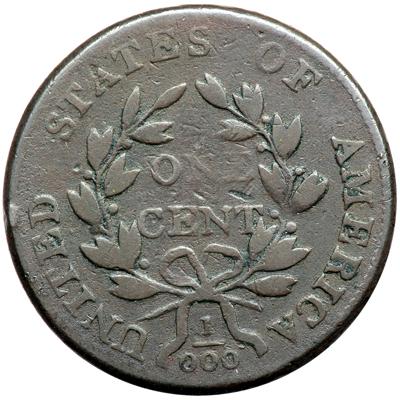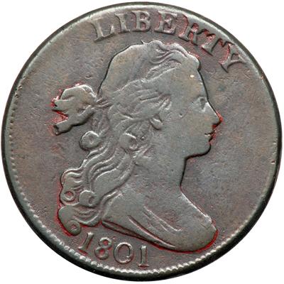 1801 S-223 R1. VG-10. Error Fraction 1/000. Rather glossy olive and steel brown. Traces of reddish verdigris show in protected areas on the obverse but the surfaces are smooth. A dull rim nick at D in UNITED is the best identifying mark. E-MDS, Breen state II. A small cud break joins the tops of RT in LIBERTY to the rim above. The date is bold and the legends are strong, including the 1/000 error fraction feature.