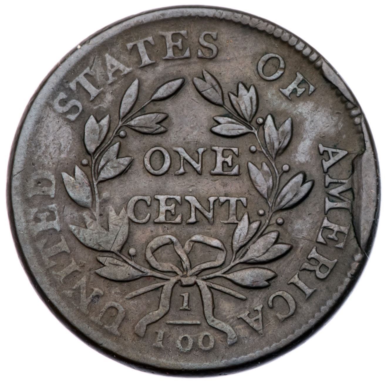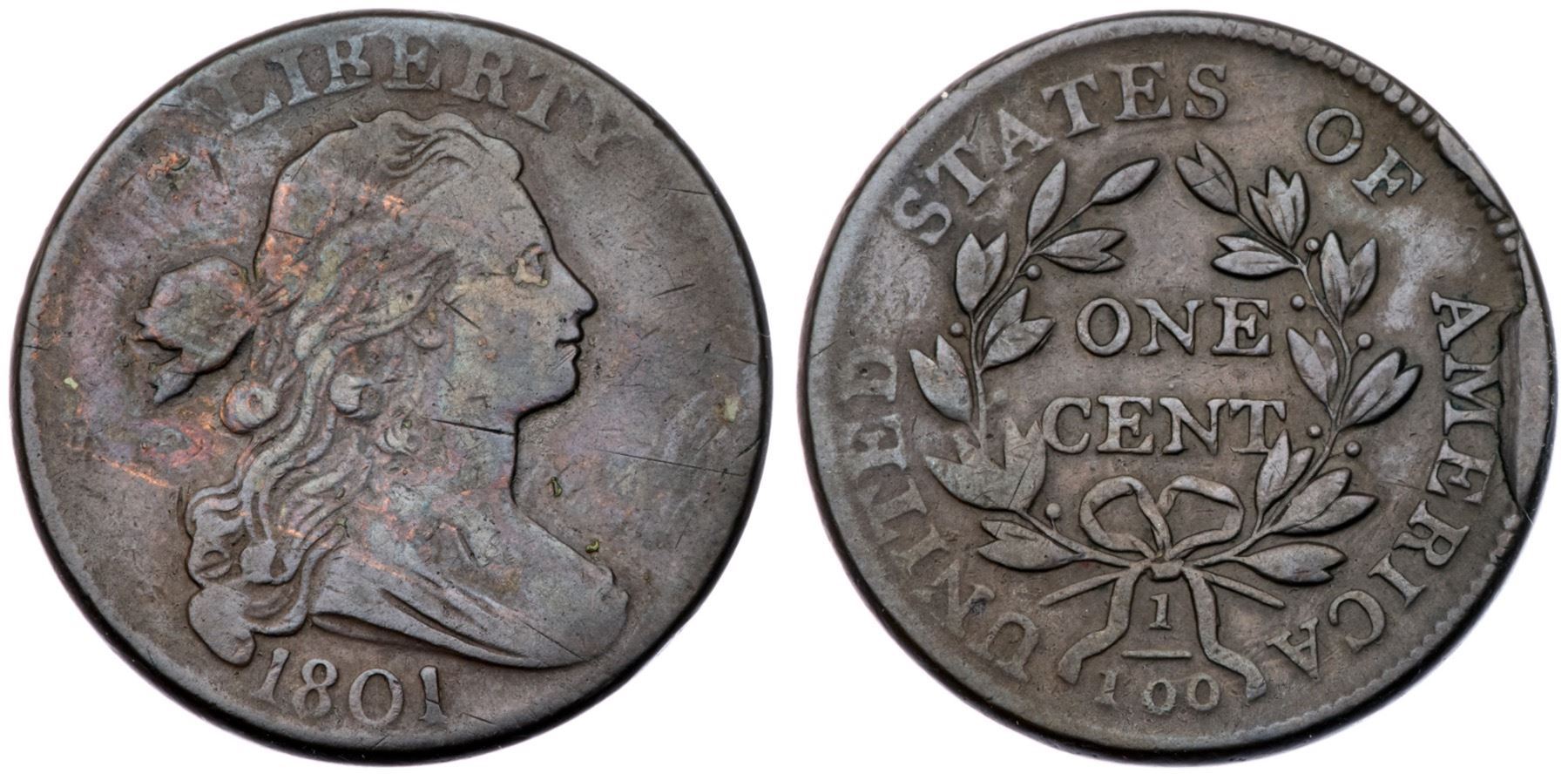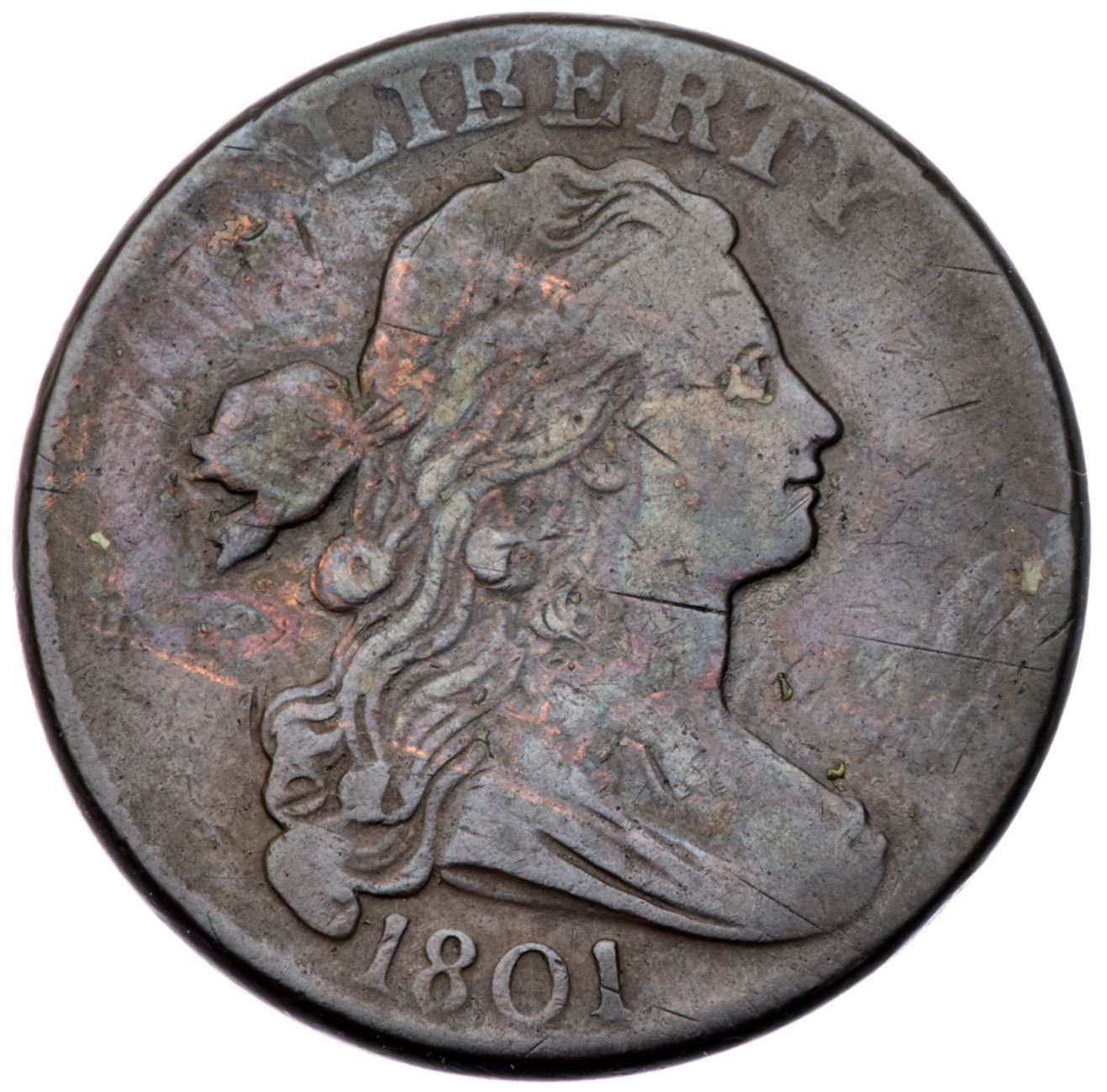 1801 S-224 R-1 F15Slightly sharper where properly struck but the left edge of the reverse is not fully impressed. Olive brown and chocolate with some lighter toning across the obverse where it appears that a piece of tape was used to secure this cent into an album. The surfaces are smooth and the only significant mark is an old scratch across the top of the neck. Rare TDS, Breen state V, with a strong rim cud at AME and a smaller but clearly defined cud at the F in OF. Graded VF20 net F12 and CC#3 of those known in the TDS. This is the plate coin for the terminal die state in the 1991 Noyes reference on the cents of 1793-1814.Certificate Number: Pedigree: From the Fred H. Borcherdt Collection