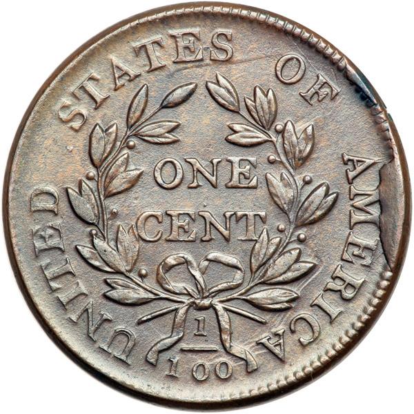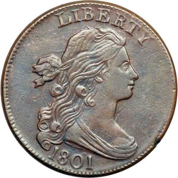 1801 S-224 R1 VF30. Sharpness near EF40 but the right half of the obverse is covered with extremely faint granularity, strongest on the cheek, and there are some tiny scratches around BERTY. In addition, there is a small planchet crack at the rim off the upper edge of the bust, as struck. No verdigris. Frosty chocolate and steel brown, the devices a couple shades lighter than the protected areas. Rare terminal die state, Breen state V, with a strong cud break at AME and a narrow but clearly defined rim cud at the F in OF. Called EF40 net VF25 and finest known of the terminal state by 10 points in the Noyes census, his photo #25023. An important piece for the die state specialist.