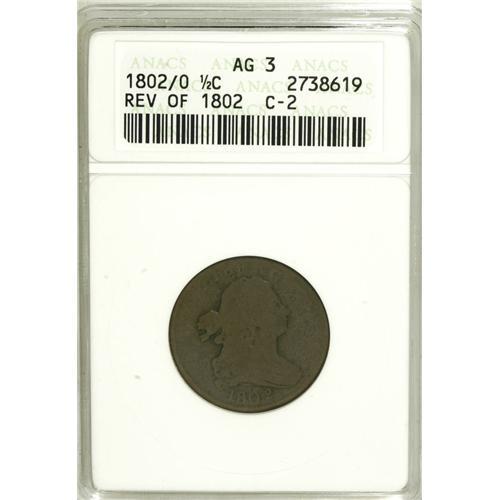 <B>1802/0 1/2 C Reverse of 1802 AG3 ANACS.</B></I> C-2. NGC Census: (0/38). PCGS Population (2/95). Mintage: 20,266. Numismedia Wsl. Price: $290. (#1057)<BR><BR><b>Shipping:</b> Coins & Currency (<a target="_blank" href="http://www.heritageauctions.com/common/shipping.php">view shipping information</a>)