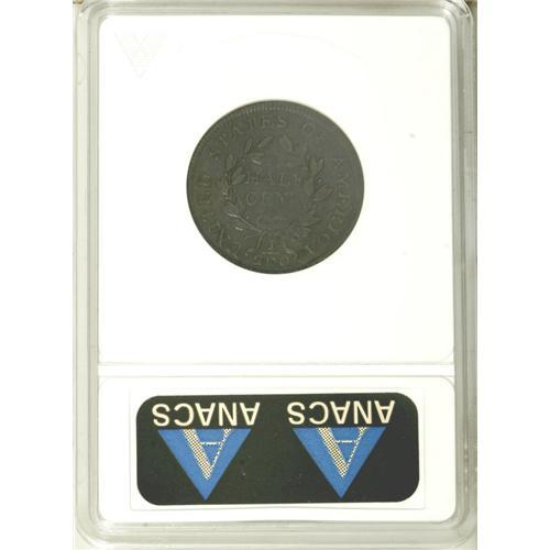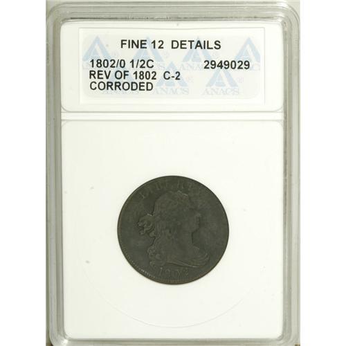 <B>1802/0 1/2 C Reverse of 1802--Corroded--ANACS. Fine 12 Details.</B></I> C-2, B-2, R.3. Manley Die State 4.0. Die rust diagnostic for the variety makes the present piece appear more corroded than it actually is, but aqua verdigris is noted at 6 o'clock on the reverse, which also has minor rim dings at 4 and 5 o'clock. EAC 4.<BR><BR><b>Shipping:</b> Coins & Currency (<a target="_blank" href="http://www.heritageauctions.com/common/shipping.php">view shipping information</a>)