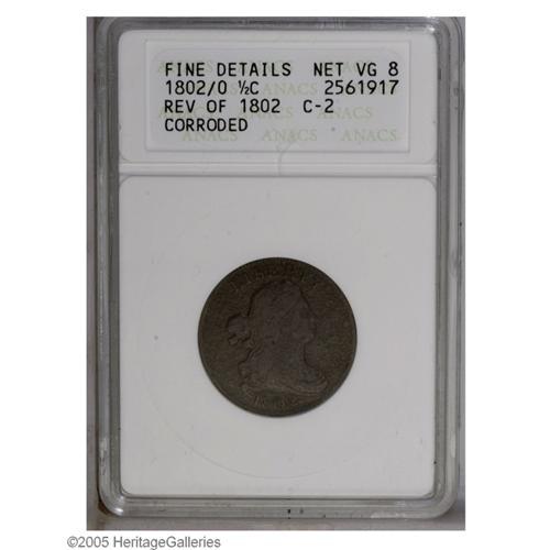 <B>1802/0<1/2 C> Reverse of 1802--Corroded--ANACS. Fine Details, Net VG8.</B></I> B-2, C-2, R.3. Manley Die State 2.0. A rough dark brown Half Cent. All legends are bold aside from a few letters in the denomination, and Liberty retains some hair definition near the ribbon. The 1802 is among the toughest dates in the Half Cent series.