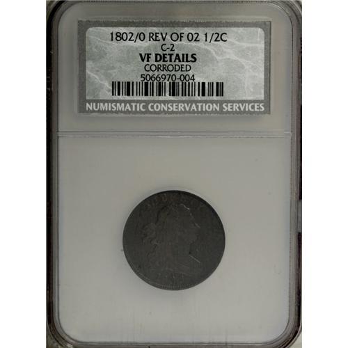 <B>1802/0 1/2 C Reverse of 1802--Corroded--NCS. VF Details.</B></I> C-2, B-2, R.3. Despite its status as the more available variety of the 1802/0, this coin is an important representative of this elusive Half Cent issue. This is an originally toned coin that shows deep chestnut-brown color over both sides. Noticeably corroded, both sides display suitable remaining detail. EAC 7.<BR><I>From The Cocoa Beach Collection.</B></I><BR><BR><b>Shipping:</b> Coin/Currency (<a target="_blank" href="http://www.heritageauctions.com/common/shipping.php">view shipping information</a>)