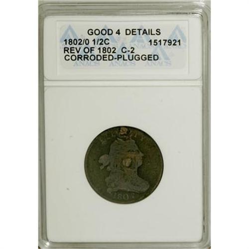 <B>1802/0 1/2 C Reverse of 1802--Corroded, Plugged--ANACS. Good 4.</B></I> C-2 NGC Census: (0/0). PCGS Population (1/4). Mintage: 20,266. (#1058)<BR><BR><B>Coin Engraver:</B> Robert Scot<BR><BR><b>Shipping:</b> Coin/Currency (<a target="_blank" href="http://www.heritageauctions.com/common/shipping.php">view shipping information</a>)
