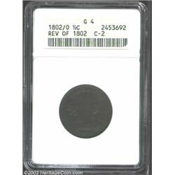 1802/0 1/2 C Reverse of 1802 Good 4 ANACS. B-2, C-2, R.3. This variety was struck from spoiled Cent stock, and this particular piece is heavily worn throughout with deep brown patina. Important notice: We expect to be auctioning lots at the rate of 200-250 per hour. Sometimes eBay Premier live bid software cannot keep up with that pace, so we strongly recommend that you place a realistic proxy bid now as insurance to avoid disappointment. Also please note that all Heritage/CAA lots purchased through eBay Premier carry a 20% Buyer's Premium. Please make sure you read the Terms and Conditions.