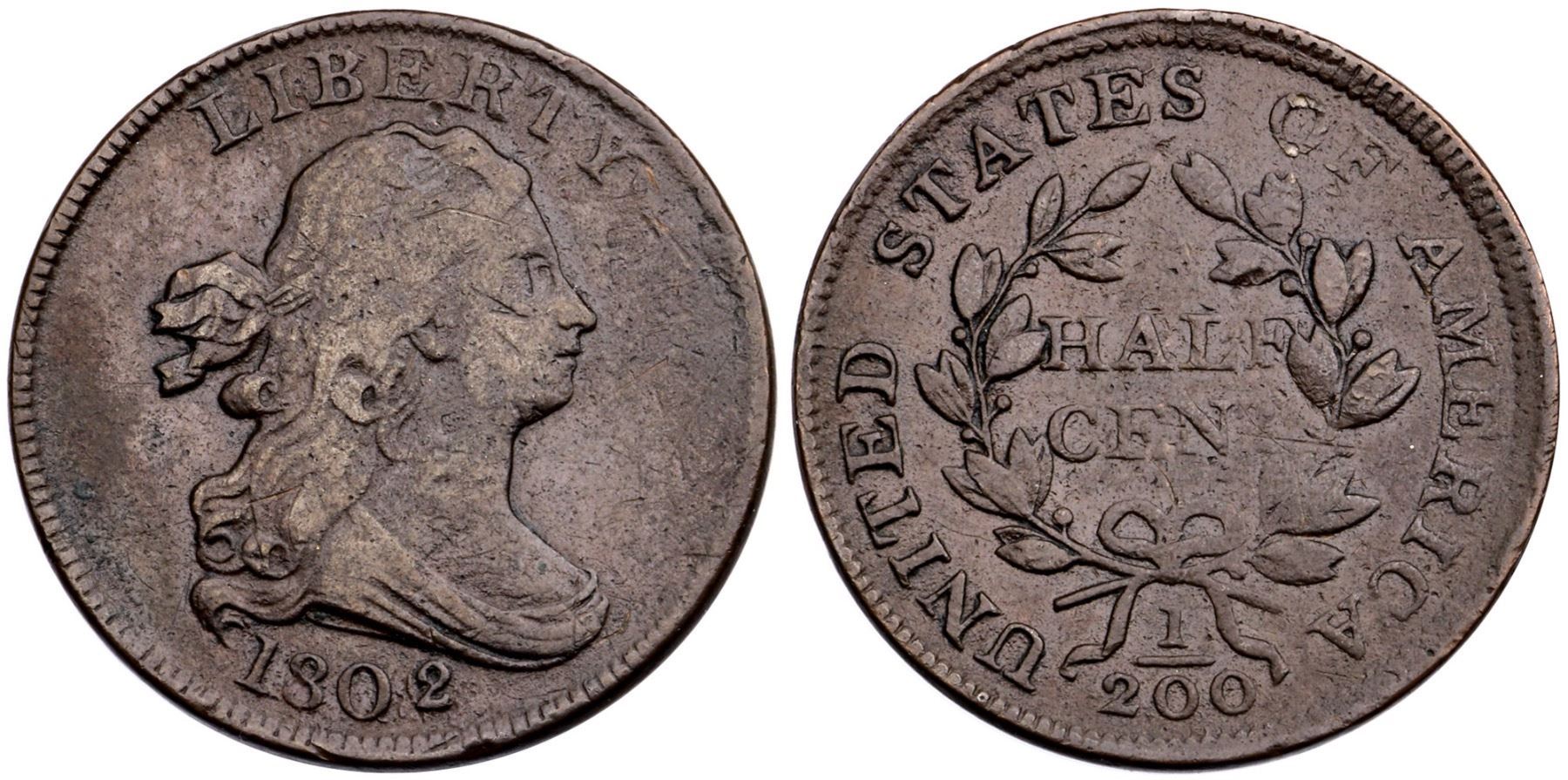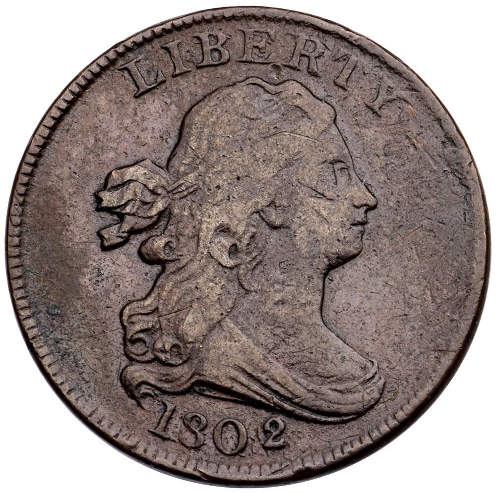 1802/0 C-2 R-3 F12A few points sharper but there is a dig under ER in LIBERTY, wispy hairline scratches right of the Y and on the portrait and fields, and another one through CENT. Attractive deep chocolate brown on rather glossy surfaces, fairly smooth for the variety. Manley state 3.0. Broken out of a PCGS Genuine Reverse of 1802 slab (1057.94/12953037).Certificate Number: Pedigree: Ex; CVM 4/2009 EAC Convention - Bob Kebler Collection