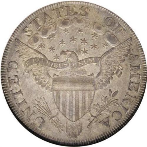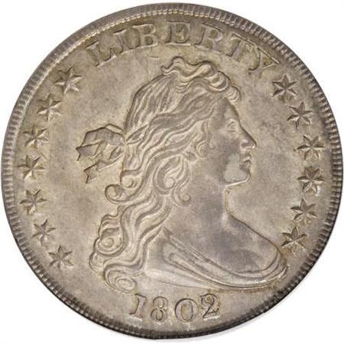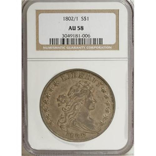 <B>1802/1 $1 Wide Date AU58 NGC.</B></I> B-9, BB-235, R.5. A small diagonal die chip is about centered between the B in LIBERTY and the tip of the hair curl. A stunning example and perhaps finest known for the variety. The B-9 was first discovered by M.H. Bolender in 1950. He had already completed the plates for the first edition of his reference, but had not completed the text. Therefore, he was able to describe the variety but unable to illustrate it. In nearly 60 years since its discovery, quite a few have been found, and it is now rated just R.5, with 50 or 60 pieces known. The surfaces are fully natural gray-brown with darker steel on the devices. Only a trace of wear is visible.<BR><BR><B>Coin Engraver:</B> Robert Scot<BR><BR><b>Shipping:</b> Coins & Currency (<a target="_blank" href="http://www.heritageauctions.com/common/shipping.php">view shipping information</a>)