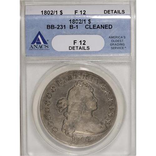 <B>1802/1 $1 Narrow Date--Cleaned--ANACS. F12 Details.</B></I> B-1 BB-231. NGC Census: (7/165). PCGS Population (1/11). Numismedia Wsl. Price for NGC/PCGS coin in F12: $1,400. (#6898)<BR><BR><B>Coin Engraver:</B> Robert Scot<BR><BR><b>Shipping:</b> Coins & Currency (<a target="_blank" href="http://www.heritageauctions.com/common/shipping.php">view shipping information</a>)