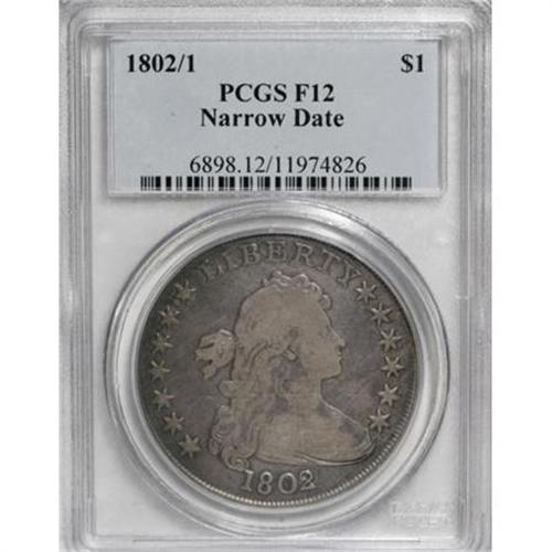 <B>1802/1 $1 Narrow Date Fine 12 PCGS.</B></I> B-4, BB-232, R.3. On this variety, the 1 in the date touches the curl, and the leftmost arrowhead is under the left edge of the left serif of the N in UNITED. Golden-gray patina uniformly covers minimally abraded surfaces on both sides. Well defined throughout.<BR><I>From The John Stimson, Sr. Collection, Part Two.</B></I><BR><BR><B>Coin Engraver:</B> Robert Scot<BR><BR><b>Shipping:</b> Coins & Currency (<a target="_blank" href="http://www.heritageauctions.com/common/shipping.php">view shipping information</a>)