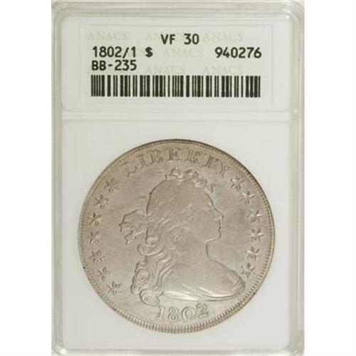 <B>1802/1 S$1 Wide Date VF30 ANACS.</B></I> B-9, BB-235, R.5. Die State III. The original Bolender silver dollar reference was published in 1950, and this variety was discovered by Bolender a short time later. In fact, it was actually discovered during production of the original edition of his reference, with a description included in the text, but it was not illustrated as the plates had already been sent to press. Many more examples have been discovered since the first notice, with about 50 specimens known today. This piece is an attractive light silver-gray example with smooth surfaces and a small reverse rim bruise at 5:30.<BR><I>Ex: John Haugh Collection (Ira & Larry Goldberg, 2/02), lot 1185.</B></I><BR><BR><b>Shipping:</b> Coins & Currency (<a target="_blank" href="http://www.heritageauctions.com/common/shipping.php">view shipping information</a>)