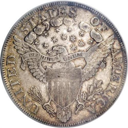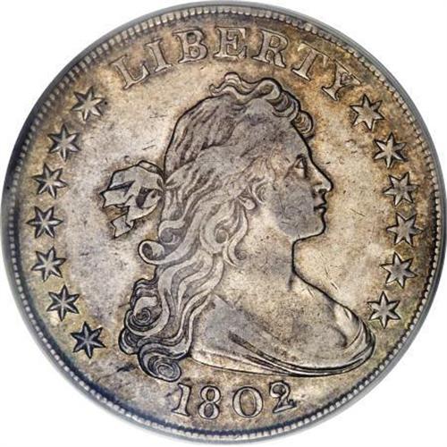 <B>1802/1 $1 Wide Date--Wing Scratched--ANACS. XF45 Details.</B></I> B-3, BB-234, R.3. The overdate is wide, with the most space between the 8 and 0. A small die crack appear in the right obverse field between stars 8 and 9, which are more widely spaced than any other pair. About half of the luster is still present, and the surfaces have silver and steel-gray centers with amber-gold peripheries. Despite ANACS' caveat, the noted scratches--a series of about six parallel scrapes through the right (facing) wing area--are scarcely visible without a loupe, due to the moderately heavy patina. This is nonetheless an attractive and original piece, with only a few other, light, grade-consistent abrasions.<BR><BR><B>Coin Engraver:</B> Robert Scot<BR><BR><b>Shipping:</b> Coins & Currency (<a target="_blank" href="http://www.heritageauctions.com/common/shipping.php">view shipping information</a>)